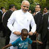 Indian PM Narendra Modi shares a lighter moment with a child during his visit to the Golden Pavilion Temple in Japan.