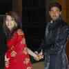 Actor Dhanush poses with his wife Aishwarya for the shutterbugs as they arrive for the 60th Filmfare Awards, held at HICC, Hyderabad, on July 20, 2013