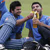 Yuvraj Singh devours a banana offered by his teammate Suresh Raina as they share a light moment during play sessions on the field.