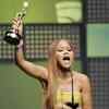 Kat Deluna gestures after winning a Casandra award in Santo Domingo on Monday, March 10, 2008. (AP Photo/Ramon Espinosa)