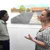 Scottish artist Marianne Greated (r) explaining her paintings to Balakrishna, IISc Associate Director at the inauguration of exhibition of contemporary art, Sonitus at Venkatappa art gallery in Bangalore. (Photo/Chethan Shivakumar)