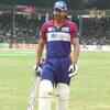 Nagarjuna pads up during the T20 cricket tournament in Bangalore on June 13, 2010.