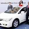 Chitrangada Singh, Honda Siel Cars India Ltd Director (Marketing) Tatsuya Natsume and VP (Marketing) Jnaneswar Sen pose with a Honda Civic car with sunroof during its launch in New Delhi on Tuesday. (PTI/Subhav Shukla)