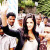 Katrina Kaif waves to her fans as she arrives to inaugurate a jewellery showroom in Hyderabad on July 20, 2012. (PTI)