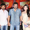 Kaarthi, Venkatesh and Praneetha during the music launch of Telugu film 'Shakuni' at Prasad Labs in Hyderabad. (BCCL/T Mallikarjun)