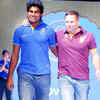 Brad Hogg and Fidel Edwards display Rajasthan Royal's 'Official Fan Wear' during a fashion show in Jaipur recently.