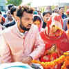 Lakshyaraj Singh Mewar with his bride Nivritti Kumari Singh Deo. The bride had her face covered throughout her way to the hotel, while people tried to catch a glimpse of her. (BCCL) /events/jaipur/lakshyaraj-and-nivritti-udaipur/eventshow/29398690.cms02