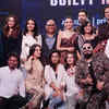 Suchitra Krishnamoorthi, Satish Kaushik, Shriya Pilgaonkar, Varun Mitra, Namrata Sheth, Sugandha Garg, Kulbhushan Kharbanda, Deepak Kalra and Jayant Digambar Somalkar pose together along with other cast and crew members during the trailer launch of web series 'Guilty Minds' at NMIMS college in Mumbai.