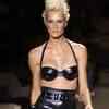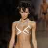 A model takes off her cover-up as she walks down the runway wearing Red Carter swimwear during the Mercedes-Benz Fashion Week Swim show in Miami Beach. (AP Photo/Lynne Sladky)