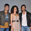 Vivek Oberoi, Kangana Ranaut and Hrithik Roshan pose for the cameras during the trailer launch of their upcoming movie Krrish 3, held at PVR ECX, Mumbai on August 05, 2013.(Pic: Viral Bhayani) See more of :