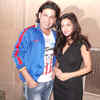 Veena Malik and Rajan Varma face the shutterbugs during the premiere of the movie Zindagi 50-50, held at Fun Republic, in Mumbai.