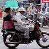 A woman pillion uses a household utensil to shield herself form the rain, in Ghaziabad - Photogallery