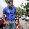 Yusuf Pathan with his fan Atul Patil who is just of one and a half foot tall, at the set of a TV reality show, in Mumbai. (PTI)