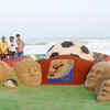 Visitors watch a sand sculpture on the FIFA World Cup by noted sand artist Sudaran Pattnaik at Puri beach. (PTI)