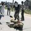 Protesters beat a policeman during 'Sopore Challo' at Qamarwari in Srinagar. (PTI)