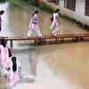 Students using benches to enter college premises, after heavy rains in Guwahati. (PTI)