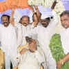 Union Minister for Railways Mallikarjun Kharge covering his face during the supporters garlands as Kharge puts drops on his eyes during the laying of foundation stone of Allalasandra road over Bridge in Lieu of LC Gate No 11 and Commissioning of road under Bridge near Judicial Layout, in Bangalore. (PTI)See more of :