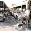 A Sudanese man looks at destroyed buses after rioters torched a fuel station in Khartoum, Sudan.  (Getty Images)