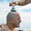 Engineer Yuri erects a stone pyramid on the head of his acquaintance and colleague Alexander as they rest on the beach in the Adler district of Sochi.