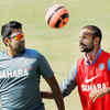 Cricketers Shikhar Dhawan and R Ashwin during the practice session ahead of their last ODI match against West Indies at Green Park stadium in Kanpur. (PTI)