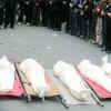 Residents of the Yarmuk Palestinian refugee camp mourn over dead bodies during a group funeral on January 26, 2014, south of the Syrian capital Damascus. Six people reportedly died as a result of food and medical shortages, while another was shot by a sniper as he was trying to collect grass to eat.