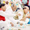 Union Home Minister Rajnath Singh, BJP MP Jagdambika Pal and Sulabh Founder Bindeshwar Pathak with Sulabh volunteers eat a meal during the occasion of National function on 'Untouchability No More' in New Delhi on Monday. (PTI)