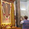 TMC member Derek O'Brien clicks picture of Rabindra Nath Tagore's portrait after paying tribute to him on his 154th birth anniversary at Parliament House in New Delhi. (PTI)