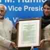 Member of Parliament, Priya Dutt receives National Amity Award on behalf of his late father Sunil Dutt from Vice President Hamid Ansari in New Delhi. (PTI)