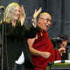 Dalai Lama is given a birthday cake during his a talk on the pyramid stage during Patti Smith's performance at the Glastonbury Festival at Worthy Farm, Pilton on June 28, 2015 in Glastonbury, England. (Getty Images)