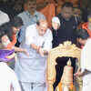 Union Home Minister Rajnath Singh along with Minister Pankaja praying at Trimbakeshwar in Nashik. (PTI)