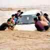 People try to retrieve a vehicle washed away by swirling flood waters following incessant rainfall at Kakching in Manipur. (PTI)