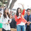 Anushka Sharma, Shah Rukh Khan and Katrina Kaif talk to the fans during the promotion of their upcoming movie 'Jab Tak Hai Jaan', in Jalandhar.