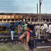 People stand near a vandalized train coach in Anand Vihar Sation in New Delhi. (PTI)