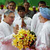 Former PM Manmohan Singh is greeted by senior Congress leader Janardhan Dwivedi during the 70th Independence Day celebrations at AICC headquarters in New Delhi. (PTI)