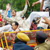Members of Swadeshi Jagaran Manch trying to cross the police barricade during their protest near the Chinese Embassy in New Delhi on June 28, 2016, after China did not support India's bid for NSG membership.