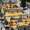 People walk over the Black Lives Matter sign painted on the street as they protest the death of George Floyd, near the White House in Washington, U.S.