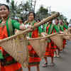 Women dressed up in traditional Assamese attire taking out a cultural procession during Namami Brahmaputra festival, at Dibrugarh in Assam.