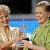() Norwegian actress Liv Ullmann(r), receives the Donosti Award from Spanish actress Marisa Paredes in recognition of her cinematic career in the 55th San Sebastian Film Festival in San Sebastian, northern Spain. (AP Photo/Alvaro Barrientos)