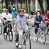 Indonesian President Susilo Bambang Yudhoyono (C) and First Lady Ani Yudhoyono ride one bike during a campaign 'Bike to Work' in Jakarta on June 20, 2008. (AFP/Adek Berry) () Indonesian President Susilo Bambang Yudhoyono (C) and First Lady Ani Yudhoyono ride one bike during a campaign 'Bike to Work' in Jakarta on June 20, 2008. (AFP/Adek Berry)
