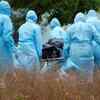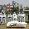 Municipal workers and relatives wearing protective suits carry the body a woman who died due to the coronavirus disease (COVID-19), for her burial at a graveyard in Chennai. (Reuters)