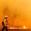 A Pacific Gas and Electric firefighter walks down a road as flames approach in Fairfield, California during the LNU Lightning Complex fire. (AFP)