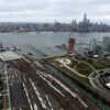 Lower Manhattan and emergency vehicles are seen in an aerial picture outside the New Jersey Transit station.