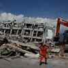A rescue team member walks in front of the ruins of Roa-Roa Hotel after earthquake hit in Palu, Sulawesi Island, Indonesia.