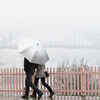A couple walking with the arch of the Sydney Harbour Bridge shrouded in fog on July 17, 2016 in Sydney, Australia - Photogallery