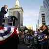 U.S. Senator and democratic presidential hopeful Hillary Clinton, speaks to a crowd of over 10,000 at a rally in Oakland, on Sunday, September 30, 2007. (AP Photo/Jakub Mosur)