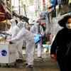 A woman wearing a mask to prevent contracting the coronavirus reacts as employees from a disinfection service company sanitize a traditional market in Seoul, South Korea. (Reuters)See more of :
