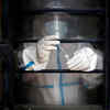 A healthcare worker puts a swab sample into a vile during the sample collection process in New Delhi.