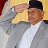 Nepal's President Ram Baran Yadav (C) salutes the honour guard after taking the oath of office at the presidential building in Kathmandu on July 23, 2008. Also in the picture are PM Girija Prasad Koirala (R) and Vice-President Parmananda Jha (L). (Reuters/Gopal Chitrakar)