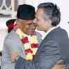 Nepal's President Ram Baran Yadav (L) is congratulated by Indian Ambassador Rakesh Sood after the oath taking ceremony at the presidential building in Kathmandu on July 23, 2008. (Reuters/Gopal Chitrakar)