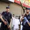 Pakistani police officers hold their weapon next to the site of an explosion in Peshawar, Pakistan on May 28, 2009.(AP Photo/Mohammad Sajjad)